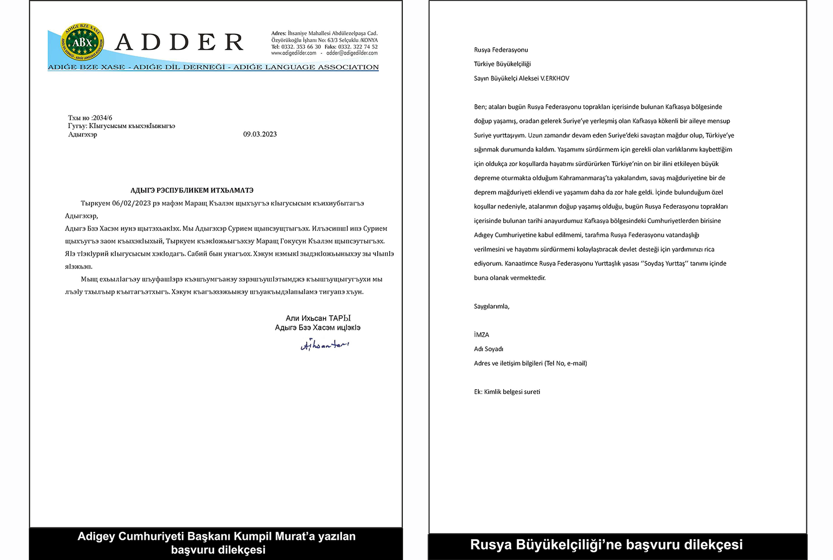 Bu 72 kişinin pasaport bilgileri ve Türkiye'deki oturum belgeleriyle birlikte Adigey’e dönüp yerleşme isteklerine dair 9 Mart 2023 tarihli “Talep Mektubu” bu üst düzey bürokratlara ulaştırılarak kendilerinden sürece yardımcı olmaları, konunun ve dilekçenin Adigey Cumhuriyeti Başkanı Kumpil Murat’a ulaştırılması istendi.